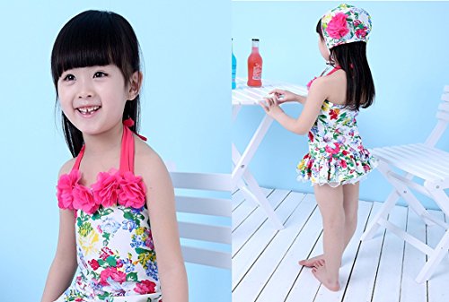 花柄のワンピースタイプの女の子用水着とお揃いの帽子付き、ホルターネックや胸元のお花がおしゃれでかわいいです。 個性的なデザインと色使いが魅力的!