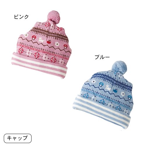 きのこ、りんご、うさぎ、お花の連続模様のノルディック柄がキュートなニットキャップ。デリケートな赤ちゃんの頭にフィットし、やさしく保護します。