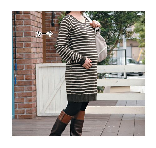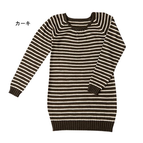 妊娠中から産後まで活躍する、あたたかなニットワンピース。シックな配色のボーダーが秋冬にぴったりです。1枚ではもちろん、スキニーやレギンスと合わせてもかわいい。