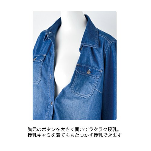 お腹が大きくなってきたら、用意したい着回し力バツグンのデニム地のワンピース。すとんと一枚で着るのはもちろん、羽織としても着られるので、シーズンレスに活躍。前開きなので産後の授乳にも便利です。