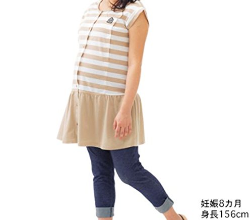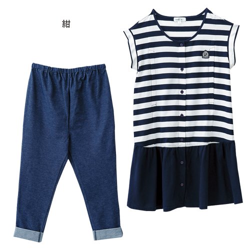 トップスはスカート風の切りかえがキュートなマタニティパジャマ。ロールアップ風デザインの7分丈パンツはデニムニット素材なので、ご近所への外出にも対応します。ワンピースなどに合わせて普段使いしてもOK。