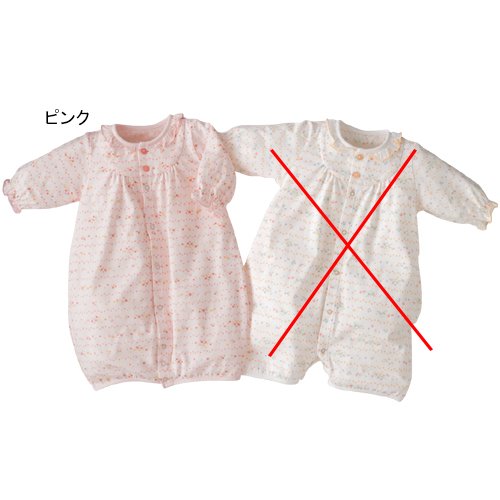 お花模様とえり元のフリルも女の子らしく、とってもスイートな仕上がり。又下のスナップボタンの留め方を変えて、ベビードレスとして、カバーオールとしてと長く使えるのも魅力です。