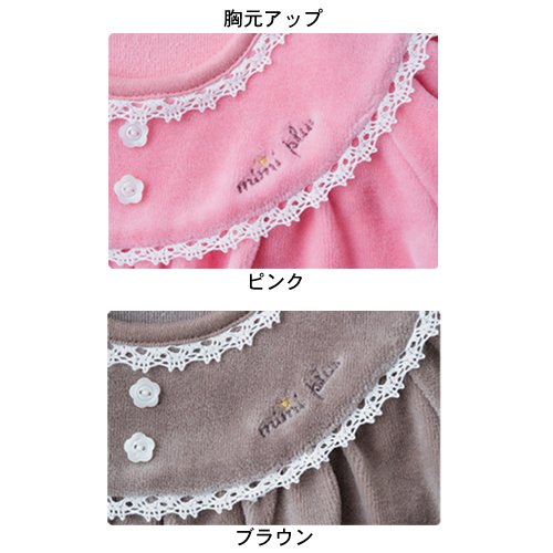 やわらかくてあたたかな、ベロア素材の兼用ドレス。丸ヨークやポケットに白いレースをあしらった上品でかわいいデザインは、退院やお披露目をいっそう華やいだ雰囲気にしてくれます。