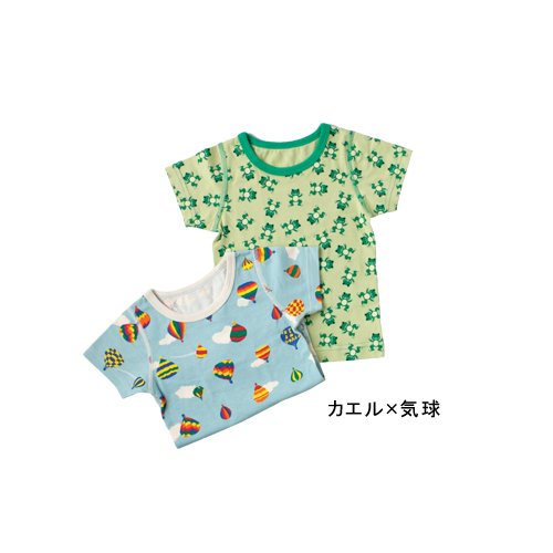 伸縮性が高く、動きやすいTシャツ2枚をセット。グリーン地にカエル柄とブルー地にカラフルな気球の総柄Tシャツです。