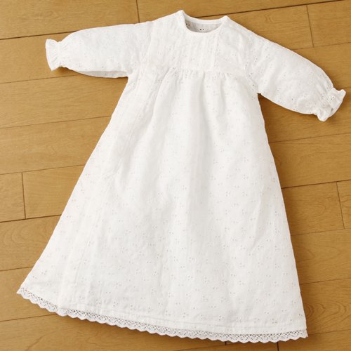 ベビーのデリケートな肌のために開発された、アロエとヒバ油で加工したガーゼのレース地を使ったベビードレス。涼しげなレースがさわやかだから、暖かい日のおひろめにおすすめ。すそのレース飾りがおしゃれ感たっぷり。