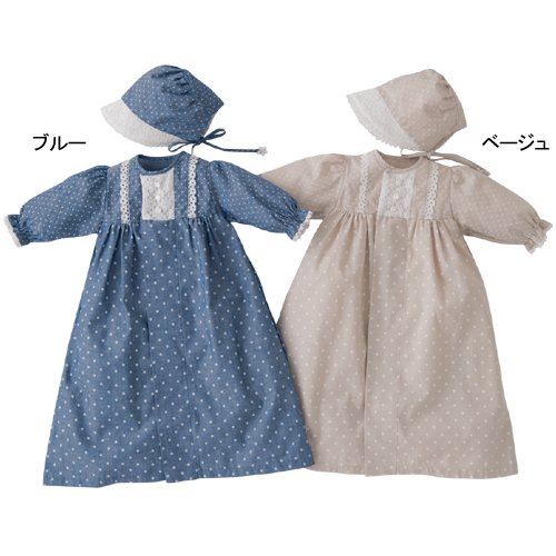 さわやかなドットにフードや胸元のレースをきかせました。ヨーク下に白い兼用ドレスをつけたユニークなデザインです。兼用ドレスは、新生児期にはドレスとして、動きが活発になってきたらカバーオールとして使えます。