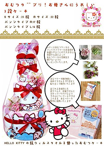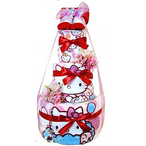 (パンパースS) おむつケーキ ハロー キティ 3段ケーキ 今治 抗菌タオル使用 スタイ ソックス 靴下 出産祝い (10月の天使の羽)