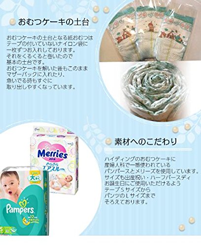 実用的で、可愛く豪華。出産祝いに喜ばれる、おむつケーキです。 頂いた方が少しの間飾っていられるよう、新生児用ではなくMサイズの紙おむつを使用。 【おむつケーキ】枚数は22枚とたっぷり使えます。ケーキを解いた後は、すべて使えるように、 スタイやタオル、玩具なのでデコレーションしています。 そして、欧米では、昔から、太陽の光があたるとお部屋に虹と幸せを運んで くれると言われているお守りとしてとても有名なサンキャッチャーもお付けします。 【ラッピング】サンキャッチャーはすべてオリジナルの手作りで天使の羽のパーツで制作しています。 ラッピングは通常のおむつケーキと違いおむつを包むセロファンに施しています。 写真ではおむつケーキに直接施している、フェイクフラワーやサンキャッチャー でおむつケーキのタオルを傷めない上、ラッピングの見た目がとても豪華になります。 ぜひしばらく飾って楽しんだ後に、解いてご使用いただけましたら幸いです。 その他 ご要望の場合はhiding.info@gmail.comまでご連絡ください。