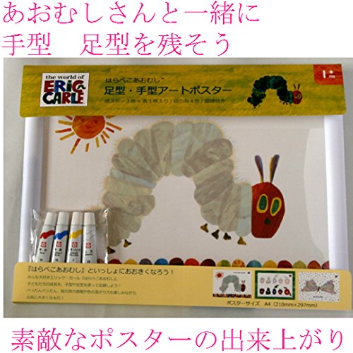 いつも変わらぬ可愛さと人気でみんなに愛されている、はらぺこあおむしさんの手型足型アートポスターです。 今年で45周年を迎える、長く皆様に愛されている人気キャラです。あのエリック カールの作品です あおむしさんのポスターに絵の具で手型足型を印刷して、オリジナルのポスターを作っちゃいましょう。 絵の具で思い思いの絵を描いて、一生の思い出を作っちゃいましょう。 手作りでポスターを作り、額縁に入れて飾っておけば素敵なインテリアになります。 3枚のポスターが入っていますので、1年目はママが作ってあげて、2年目3年目は自分で考えて作るような使い方が出来ます。。 台紙はにじみにくい紙を使用していますので、綺麗にスタンプできます。 ポスター(21cmx30cm)3枚 試し刷り用台紙1枚 額縁(24cmx34cm) 絵の具4色がセットされています。 出産祝いにもいいですね。日本製が嬉しい