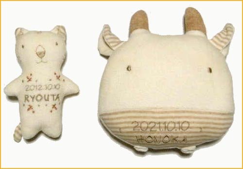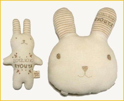 ひとつは持っていたいのが抱っこ枕です。お出かけの時などに抱っこ枕を持っていれば 赤ちゃんを安定して抱っこできるので、とっても重宝いたします。 また吸湿性もありますので、赤ちゃんの頭とママの腕の汗をどんどん吸湿していきます。 さあママの腕に取り付けてお出かけだ。まさにお出かけの時の秘密兵器ですね。 ガラガラにぎりおもちゃは、大きさもあるので、ぬいぐるみの様にも使えるし、中に鈴が入って音も出る優れものです。 1つ1つ手つくりをしてお名前とお誕生日を刺繍いたします。 お値段は少々高めですが、それだけの作りと素材と仕上がりで、自信をもってお勧めいたします。 大切な赤ちゃんには、やっぱり良品を与えてあげたいですね。 お手数ですが刺繍するお名前と生年月日と字体は、ご注文後ご連絡を差し上げてお問い合わせをさせていただきます。