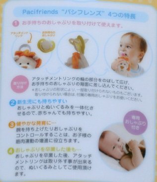 今話題のぬいぐるみにオシャブリが付いた、パシフレンズがハイディにも登場いたしました。 ぬいぐるみの頭の部分にオシャブリの乳首が付いています。 赤ちゃんはぬいぐるみを抱っこして一人遊びをしながら、同時におしゃぶりも出来ちゃうすぐれものです。 自分で抱っこしながらおしゃぶりをしますので、指や腕の力の育成に一役かいますね。 乳首は取り外して洗えますので、いつも衛生的に使えます。 乳首を取り付ける台座も取りはずせますので、大きくなられたらぬいぐるみとしても使えます。 赤ちゃんは小さい時に抱っこしていたものに愛着を感じています。ですのでぬいぐるみとして長く使えるのも嬉しい。 また、オシャブリはよく落としたり、なくなったりしますね。これだけ大きければ大丈夫ですね。 お洗濯は手洗い、もしくはネットに入れて弱洗いが可能です。 可愛くて使い勝手の良いパシフレンズを是非1度お試しください。。 サイズ=身長 約28cm 出産祝いやギフトにもどうぞ