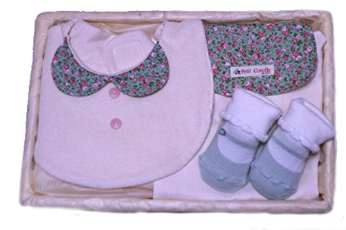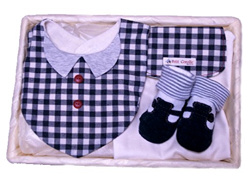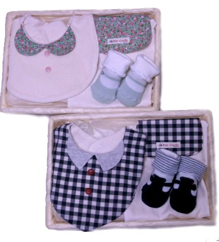 - おしゃれ仕立てのベビー用品ギフトセット。オシャレスタイと靴下と汗取りパットの3点セット