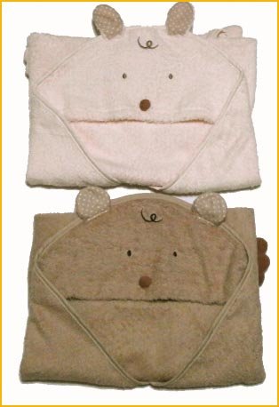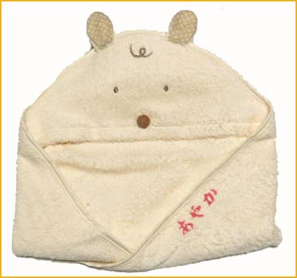 くまとうさぎのかわいいアフガン(おくるみです)です。顔のところがフードになっています。タオル製のおくるみは吸湿性と保温性にすぐれしかもお洗濯に強いといゆう特性のあるすぐれた商品です。フードの所を赤ちゃんにかぶせおくるみで包むと、くまさんに抱っこされているみたい。 アフガン(おくるみ)は退院時や1ヶ月検診など小さな赤ちゃんには、必需品なのです。 大きくなられても、お昼ねなどの掛け物、バギーなどの敷物として、多目的に使えます。 そんなアフガン(おくるみ)をクマさんとウサギさんで、可愛く作りました。 顔のところがフードになっています。フードの所を赤ちゃんにかぶせおくるみでつつむと くまさんやうさぎさんになったみたいで可愛いですよ。 また、手のモチーフが付いていますので、くまさんやうさぎさんに抱っこされているようにも見えます タオル製のおくるみは吸湿性と保温性にすぐれしかも、お洗濯に強いといゆう特性のあるすぐれた商品です。 出産祝いやギフトにもどうぞ。 お名前刺繍も入れることが出来ます。 世界でたった1枚のおくるみの出来上がりです。 525円のお名前刺繍代金が、別途かかります