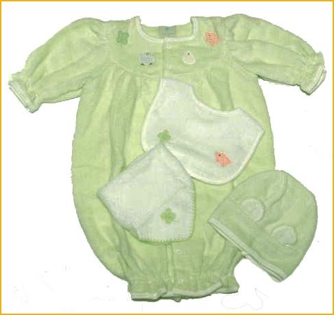 無撚糸というとても柔らかな特殊綿を使用したベビー服のセットです。とにかく柔らかでふわふわな素材で、お見せできないのが残念ですが、赤ちゃんのお肌には最適な素材ではないでしょうか。