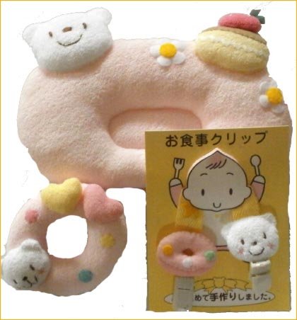 ママの秘密兵器抱っこ枕でドーナツ枕とお揃いのスタイホルダーとガラガラのセットです
