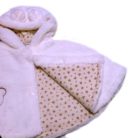 これからの季節に1枚あると便利なお召しものがケープ マントです。 軽くて暖かなボア素材はぜひとも揃えておきたいアイテムです。 ケープはお袖がなく羽織るだけですので動きやすいし、窮屈感もないので赤ちゃんは大喜びです。。 また気候に合わせた体温調節にもマントは重宝致します。 無地素材ですので、色んなお洋服と重ね着しても大丈夫で合わせやすい仕上がりとなっています。 マント ケープはお召しになると、お体とお洋服の間の空間がたっぷり出来ますので、 それだけ多くの空気を抱き込めますので、とっても暖かです。 脱ぎ着も簡単ですので、これからの寒い季節のい味方です。是非1枚揃えておきたいですね 可愛いフードが付いていますので、更に暖かに調節することが出来ます。 また、お洋服全体に薄く中わたを入れ込んでいますので、とっても暖かく仕上がっています。 裏地に可愛いプリント地を使用しているのが素敵ですね。さりげない裏地のおしゃれはセンスのいいママのグッドチョイスです また裏地は綿100%ニット製ですので、お肌に触れる部分は綿ですので安心ですね ケープの裾にはスナップが付いていますので、ポチッ留めるとお袖のような状態になります。 大きくなられたらそのお袖に腕を通してコートのようにしてお召しになれるのが嬉しい 出産お祝いやギフトにもどうぞ サイズ=80cm~90cmサイズ