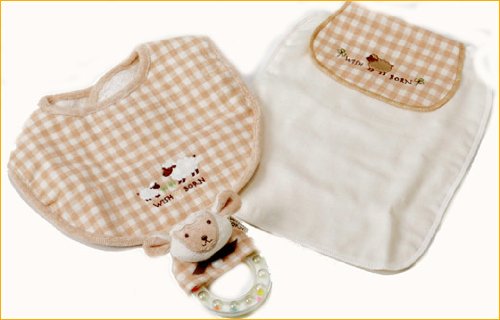 人気のひつじさんシリーズに可愛いカゴ入りギフトが出来ました。 オーガニックコットンを使用し、ガーゼとパイルを組み合わせた高級ベビーギフトです。めちゃめちゃ柔らかですよ しかも日本製でこのお値段はとってもお値打ちで嬉しい。 アイテムもスタイと汗取りタオルとリングがらがらの3点セットでどれも重宝で必要なものばかりです。 スタイは表ガーゼの裏パイルでとっても柔らか。 汗取りタオルは赤ちゃんの背中に入れてあげて、汗でびしょびしょになったらサッと引き抜いてあげれば、いつも背中は爽やかです。 激しい新陳代謝でいつも汗をかく赤ちゃんの秘密兵器です。 本体は綿地で、チェックの部分はガーゼ製です。サイズは20cmx25cm またカゴ入りですので容器のカゴは後から色んなことに使えてとっても便利でおやれなギフトですね サイズ=新生児から。日本製が嬉しいベビー用品です。