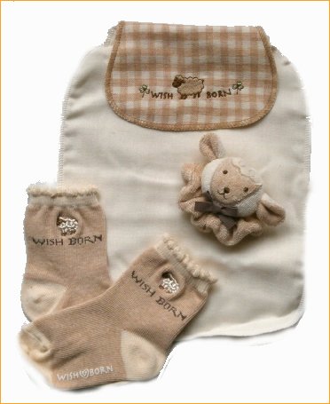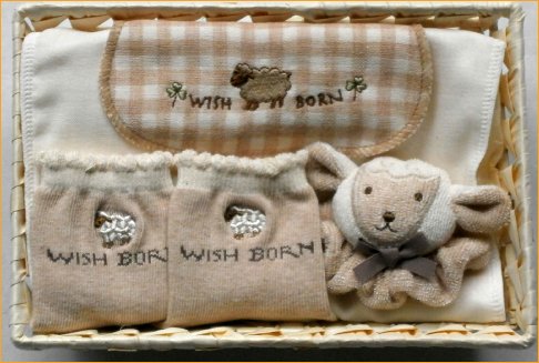 人気のひつじさんシリーズに可愛いカゴ入りギフトが出来ました。 オーガニックコットンを使用し、ガーゼとパイルを組み合わせた高級ベビーギフトです。めちゃめちゃ柔らかですよ しかも日本製でこのお値段はとってもお値打ちで嬉しい。 アイテムも靴下と汗取りタオルとリストラルがらがらの3点セットでどれも重宝で必要なものばかりです。 赤ちゃんは背中にいっぱい汗をかきます。特におっぱいやミルクの時などはびっしょり書きますね。 そんな時ひとつ有ると便利な汗取りタオル。赤ちゃんの背中はいつも爽快です。 本体を赤ちゃんの背中に入れてあげて、チェックのベロの部分を襟から外に出しておきましょう。 汗でびしょびしょになったらさっと引き抜いてあげれば、またお洋服の背中は快適な状態になります サイズ=20cmx25cm リストラルガラガラです。赤ちゃんの手首にはめてあげれば、手を動かすたびに音が出るので、赤ちゃんは興味津々 またお昼寝などの時にはめておいてあげれば、おっきしたのがすぐわかって便利ですね、 ゴム製の輪になっていますので、はめるのはとっても簡単 上品で可愛いがらの靴下です。靴下は何枚あっても重宝するものです。 いつも新しくてきれいな靴下をはかせてあげたいですね またカゴ入りですので容器のカゴは後から色んなことに使えてとっても便利でおやれなギフトですね サイズ=新生児から。日本製でオーガニックコットンが嬉しいベビー用品です。