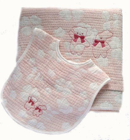 ふくれ織りガーゼの高級素材で仕上げた、おくるみ兼ガーゼケットとスタイのセットです。色んな使い方ができるのでとっても便利です。 ふくれ織りとはガーゼを立体的に織り上げ、でこぼこの表面に仕上げています。 ですので、肌触りは抜群で、吸湿性 通気性に優れ保温性にも優れています。厚みも出るので型崩れもしにくいです また。強度を増すために綿80%ポリエステル20%の素材を使用しております。 そんなガーゼで仕上げた高級品です。肌触りは抜群で軽くてふわふわで吸湿性に富んだ優れものです。 お風呂のタオルに湯上りタオルに、おくるみアフガンにお昼寝の時の掛け物に、バギーの掛け物にとご用途はいっぱい。 お揃いのスタイはガーゼ製ですので、吸湿性は抜群。お口にも優しいですよ。 また丸洗いが出来、洗う度に柔らかさが増していくのが嬉しい。ガーゼですので速乾性もあります。 お揃いのスタイをして、この可愛いおくるみでお出かけすれば、もう注目の的です。 おくるみサイズ=85cmx85cm。スタイサイズ 23cmx20cm。出産祝いやギフトにもどうぞ 日本製でガーゼ素材を使用してこのお値段は嬉しい。やっぱり良い物は良いですね。