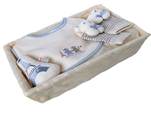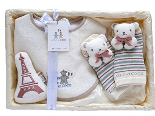ヨーロッパテーストの押さえた色目が可愛いベビーギフトセットが出来ました。 スタイ マスコット付き靴下(フットトイ) ガラガラおもちゃの3点セットです。 オーガニックコットンを使用し、丁寧に仕上げた一格上のベビーギフトです スタイは表オーガニックコットン裏パイル仕上げです。やわらかくて吸湿性にとんだ高級スタイです 肉厚でパイル地を貼り合わせていますのでしっかりと仕上がり、毎日のお洗濯にも強く型崩れしにくいのが嬉しい マスコット付き靴下もオーガニックコットンで、2箇所に滑り止めが付いてています。サイズ=9cm-11cm マスコット付き靴下は保温性と足保護になり、さらにおもちゃとして使えるフットトイとして人気です。 自分で動くと熊さんも動くので赤ちゃんは興味深深で一人遊びを始めます。隠れた人気アイテムです 鈴の入った塔のおもちゃはは可愛い音が出て、握りやすい大きさなので赤ちゃんは大喜びです。 後で色んな用途で使える便利かごに入っているのが、嬉しいですね 淡い色と抑えた色目でヨーロッパ感覚に仕上げたとっても上品で高級感のあるギフトです。 お値段だけの価値があるギフトセットです。 半年くらいから オーガニックコットン使用 日本製