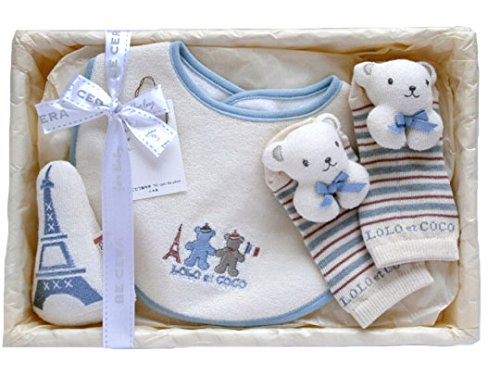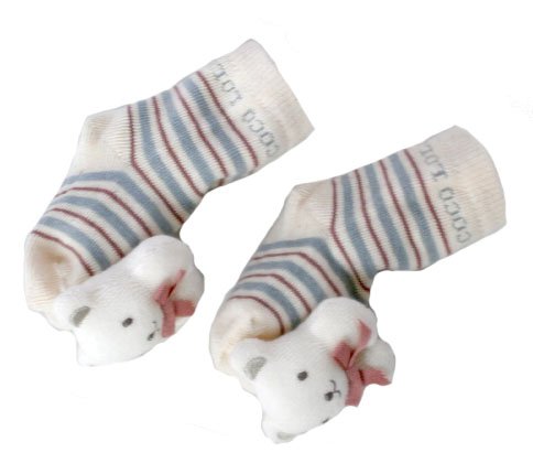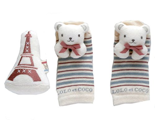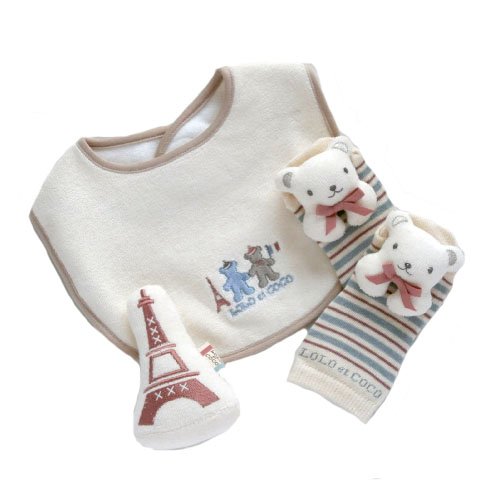 - ヨーロッパ感覚の抑え目の色が素敵。2枚合わせのの高級スタイ、マスコット付き靴下(フットトイ)ガラガラおもちゃの3点セットです。