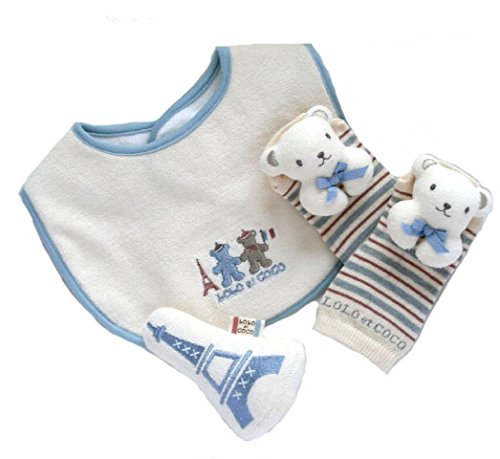 - ヨーロッパ感覚の抑え目の色が素敵。2枚合わせのの高級スタイ、マスコット付き靴下(フットトイ)ガラガラおもちゃの3点セットです。