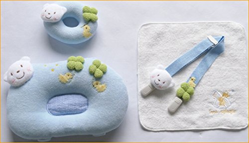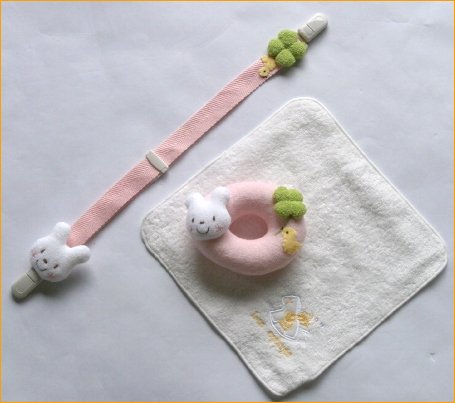 - 抱っこ枕とスタイクリップとガラガラとミニタオルの4点セットです