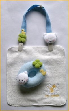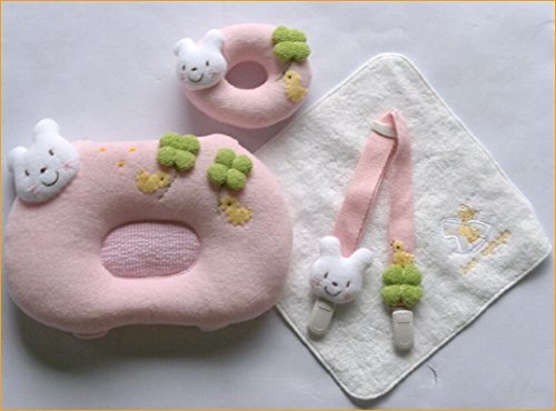 こんなギフトが欲しかった!! 便利で重宝する、柔らかパイルで作ったかわいいベビーだっこ枕兼ドーナツ枕です。一人二役の優れものです。 この枕とお揃いのスタイホルダーとガラガラがセットになったギフトが出来ました。 抱っこ枕として使うときは、背中に付いているループに腕を通して、ママの腕に取り付けて赤ちゃんを抱っこしてください。 ママの腕に取り付けたベビー枕が丁度いい具合に枕になります。 おっぱいをあげたり、だっこして寝かせる時 赤ちゃんは沢山汗をかきます。またお母さんの腕も汗だくになります そんな時ダッコ枕が威力を発揮いたします どんどん汗を吸湿していくので、赤ちゃんの頭も ママの腕もいつも爽快でこれからの季節には最適です 赤ちゃんの頭も安定しますので安心してダッコされてます。お出かけの時も、便利ですね また普通にベッドに置いて使えば、定番のドーナツ枕としても使えます。 まだ首のしっかり据わらない赤ちゃんには、ドーナツ枕をぜひ与えてあげて安心安定した眠りをして欲しいですね。 スタイホルダーはお出かけや急な時にママのミニタオルやハンケチをパチッとはさめば、 すぐにスタイに変身させられる便利グッズ。何枚あっても重宝するミニタオルも付いています ガラガラは、持ちやすくて肌触りもよくて音もきれいな優れもの。 以上4点をセットにしたギフトです。贈ってもとっても喜ばれる逸品です。 出産お祝いやギフトにもどうぞ 綿100% 手洗い可