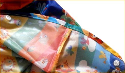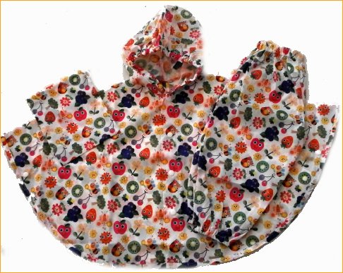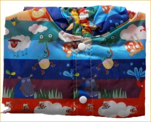 レインコートの最強アイテム==パンチョの登場 レインポンチョとレインパンツの上下セットのレイングッズです。 普通のレインコートですとどうしても足元が濡れてしまいます。パンチョはポンチョとパンツのセットですので 足元もしっかりと雨からガード致します。さらに裾にはゴムが入っていますのでしっかりと裾を留められ、長靴のなかに入れればばっちりです。 上着のポンチョもすっぽりと上半身を被い、フードにもゴムが入っていますので大部分のお顔をガードできます パンチョさえあれば少々の雨なら傘なしで歩けますので、安全に雨の中を歩けますね。 またポンチョの袖の部分にはスナップが付いていますので、留めることによりお袖の様な状態にすることが出来ます。 ですので手を出してお召しになるポンチョとして、すっぽり被せてしまうケープとしても使える便利物です 更にすごいのは、急な雨でもすぐに取り出せてベビカーに乗っていたり、抱っこひもで抱っこしたままでもすぐに着せられます。 またお揃い柄のポーチが付いていますので小さく畳んで持ち運びも便利なすぐれ物です。 雨が心配の日もママのバッグに入れて持ち運べば安心です。小さな巾着に収納出来ますのでママのバッグの邪魔にもなりません。 色も綺麗で柄も大胆で可愛いので、ゆうつな雨の日も気分は爽快で歩けますね サイズ=90cm 1歳ー2歳くらい