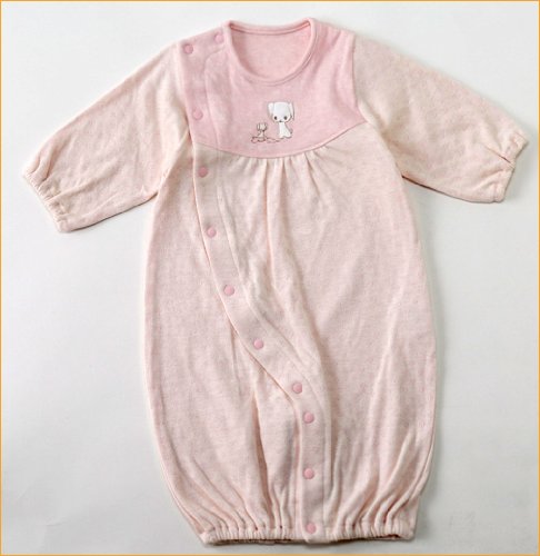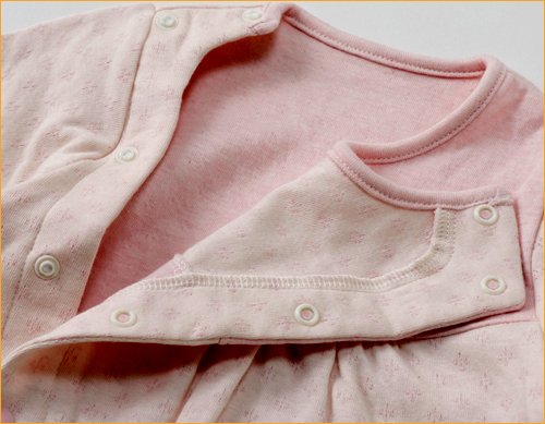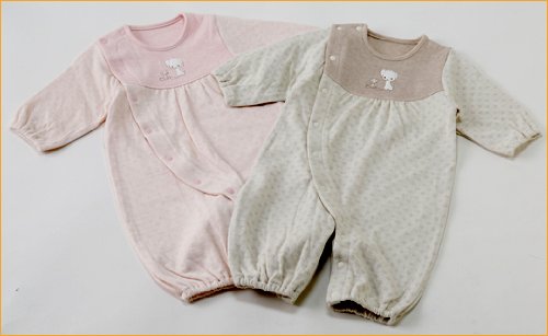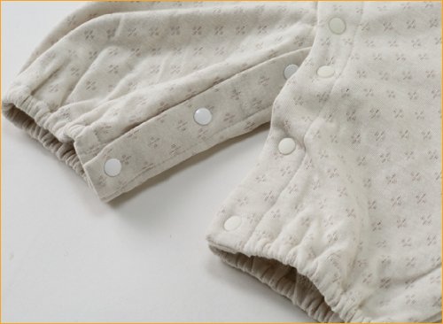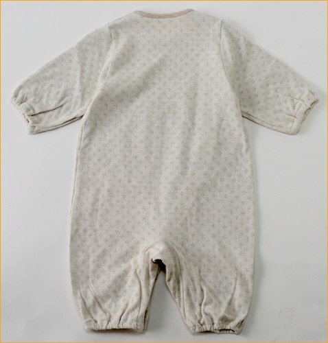 柔らかなオーガニックコットンのニット製のベビー服です。 お肌にやさしく着心地も快適な高級ベビー服が出来ました 大切な赤ちゃんには上質の衣料環境を与えてあげたいですね。 このオーガニックコットンは3年間以上無農薬で栽培した綿だけを使用している優れものです しかも国内生産によるしっかりとした管理体制より生み出された逸品ですので 出産祝いやギフトにも最適です。送って安心、もらって嬉しいベビー服です。 またこの2WAYドレスオールは、裾のスナップを留めかえるだけで、ベビードレスとしても カバーオールとしても使用できます。 また、前部のスナップはななめに取り付けていますので、うつ伏せ寝しても痛くないような仕上げをしています。 素材も細番手の糸を使用していますので、とっても柔らかで肌触りが良いです。 赤ちゃんの必需品のベビードレスにぜひこのオーガニックコットン製の商品を加えて下さい。 細部にまで気配りをしたベビー服をぜひお試しください。 赤ちゃんの事をしっかり考えて仕上げていますので、出産祝いやギフトには最適です。 またベビードレスは何枚有っても重宝いたしますので貰って嬉しい逸品です サイズ=新生児ー半年過ぎくらい