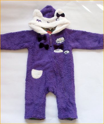 利なお召しものがカバーオールです。 軽くて暖かなボア製ベビー服ははぜひとも揃えておきたいアイテムです。 赤ちゃんをスッポリ包んであげるので、とっても暖かです。 またあまり見かけないパープルなど、鮮やかな色が特徴の商品です。 フードが付いていますので暖かさの調節も出来ます。 着ぐるみとして、またおくるみとしてもご利用になれます。 シンプルな無地柄にワンポイント刺繍が上品で高感度な商品に仕上がっています。 ファスナーで脱ぎ着をしますが、お子様のももまで達する長いファスナーを使用してますので、脱ぎ着はワンタッチでとっても簡単。 脱ぎ着も簡単ですので、これからの寒い季節のい味方です。是非1枚揃えておきたいですね。 軽くて暖かで上品な仕上がりは、センスのいいママのグッドチョイスです 出産お祝いやギフトにもどうぞ サイズ=80cm サイズ