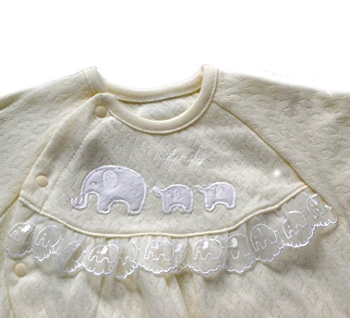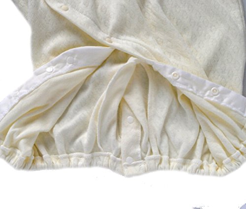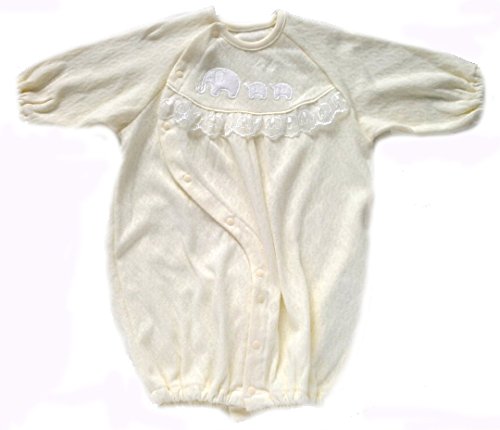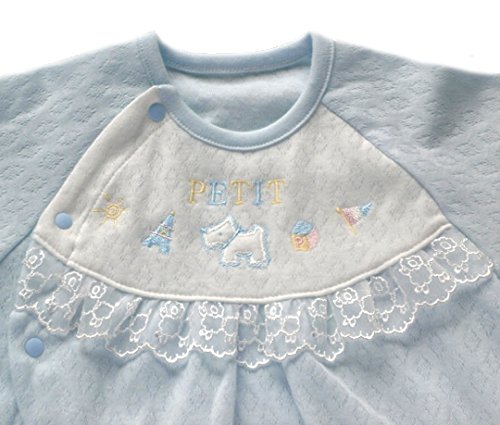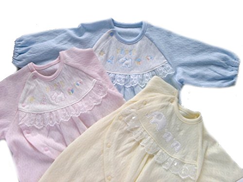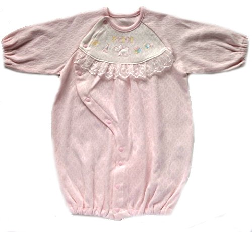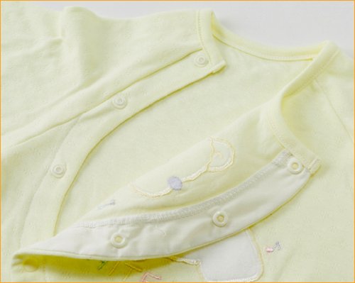 柔らかな綿ニット製のベビー服です。薄手生地を使用していますので、暑い季節にはうれしいですね。 お肌にやさしく着心地も快適な高級ベビー服が出来ました 大切な赤ちゃんには上質の衣料環境を与えてあげたいですね。 このタイプのベビー服は新生児からすぐに使う、赤ちゃんの必需品です。何枚あっても重宝するし、洗い替えにも何枚も必要です。 ぜひこんな淡い色目で上品なベビードレスをお揃えください。 2WAYドレスオールは、裾のスナップを留めかえるだけで、ベビードレスとしても カバーオールとしても使用できます。 また、前部のスナップはななめに取り付けていますので、うつ伏せ寝しても痛くないような仕上げをしています。 素材も細番手の糸を使用していますので、薄手でとっても柔らかで肌触りが良い綿ニット製です。 更にはり抜きの綿ニットですので通気性があって」、涼しくお召しになれます。 アップリケも可愛く細部にまで気配りをしたベビー服をぜひお試しください。 しかも、アップリケと同柄のレースを使用している手の込んだ仕上げをしています。 出産祝いやギフトにも最適です。送って安心、もらって嬉しいベビー服です。 赤ちゃんの事をしっかり考えて仕上げています。 ベビードレスは何枚有っても重宝いたしますので貰って嬉しい逸品です サイズ=50cm-70cm 日本製です。