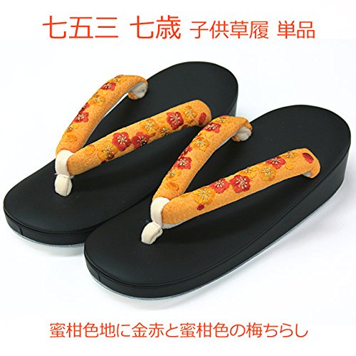 七五三 草履単品 7歳用 黒台刺繍 日本製 ちりめん刺繍鼻緒 蜜柑地に金赤と蜜柑色の梅ちらし