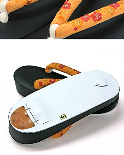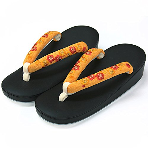 ツヤ消しのマットな黒の台、パッと明るい蜜柑色な縮緬鼻緒に同系色の金赤と蜜柑色の花がナチュラルな色合いです。