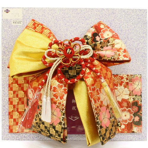 七五三 女児五歳用 高級金襴織 お子様結び帯 朱赤地に変わり市松梅桜 M-6