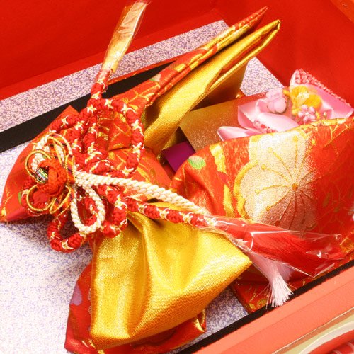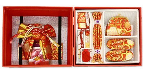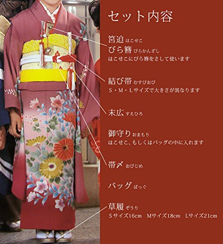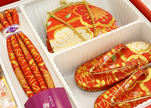 内容 結び帯、バッグ、草履、帯締め、末広(扇子)、髪飾り、箱迫(はこせこ)、御びら簪(びらかんざし)、お守り