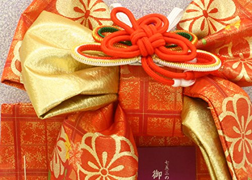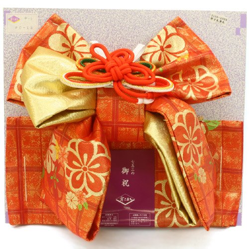七五三 女児五歳用 高級金襴織 お子様結び帯 オレンジ地にモダン格子と重ね梅 M-1
