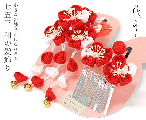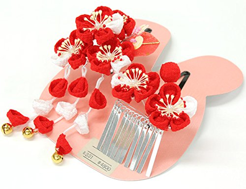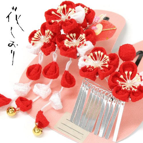 七五三 お子様用 髪飾り2個セット 《花しおり》ちりめん つまみ細工 赤と白の紅白梅(レッド) 331