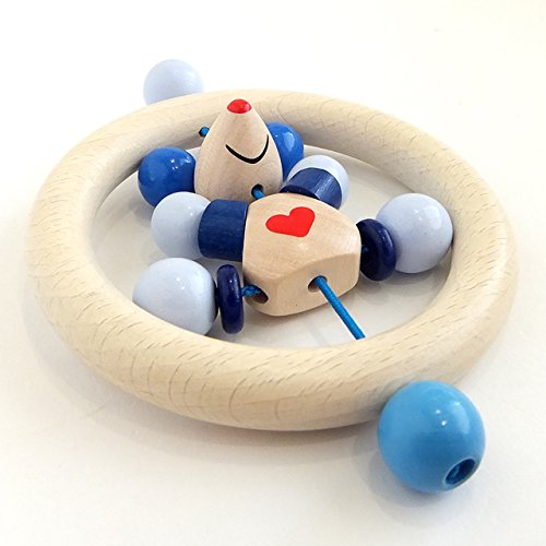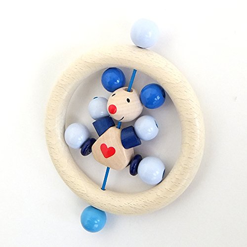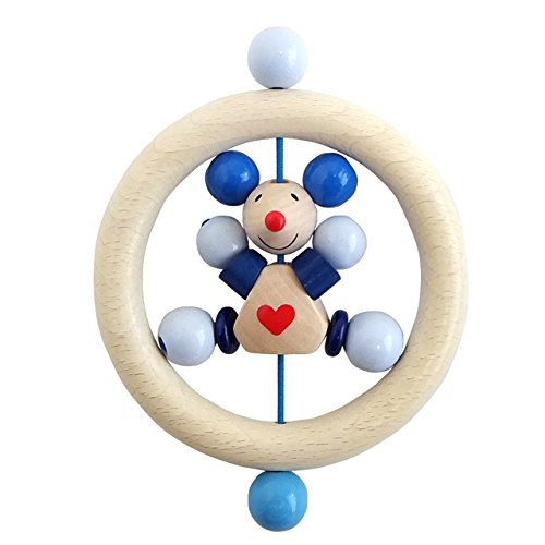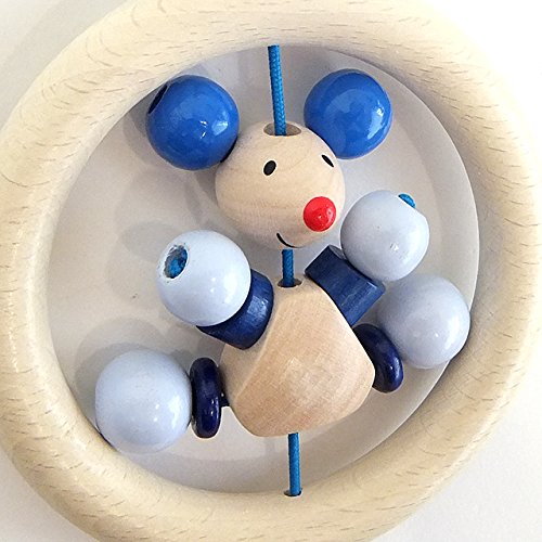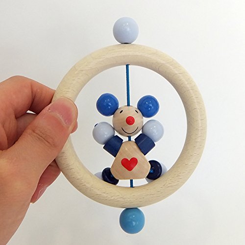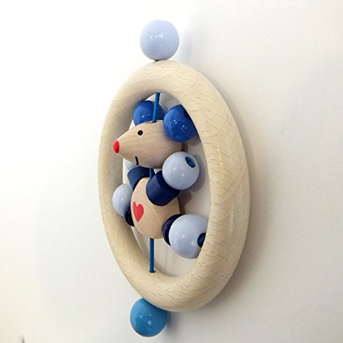 両手でカップを持つイメージで、左右の手で同時にしっかり握れるサイズです。 さわやかなブルーのお色です。振るとねずみちゃんが動いてカチャカチャと木がぶつかり合う自然な音が出て赤ちゃんも大喜びです。もちろん、カラーの部分も舐めても大丈夫で歯固めとしてもガジガジ噛んで遊んでいただけるかわいい木のおもちゃです。