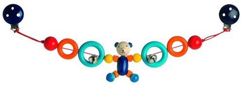 ドイツのハイメス社の木製ベビーカーチェーン。鮮やかな色使いが印象的な仕上がりで、中央にはクマのおもちゃが取り付けられている。両端がクリップになっており、ワンタッチでベビーカーに取り付けられる。子どもがなめても安全な塗料を使用している。ヨーロッパでのおもちゃ安全基準「EN71」適合商品。