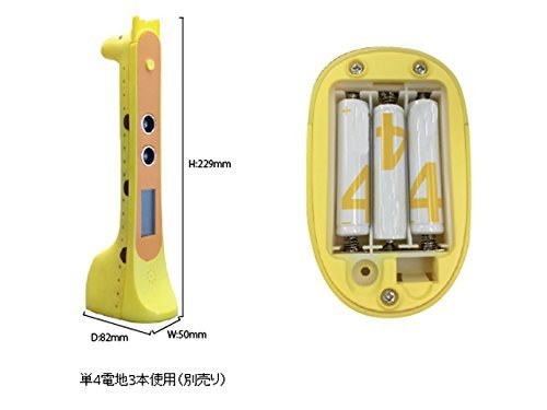 どんなに背が高くても大丈夫! 3秒でカンタンに身長が測れちゃう! ◆誰でも簡単、ボタンを押すだけですぐに身長がはかれるデジタル身長計垂直な壁にキリンの底面をピタリとくっつけて身長の基準をつくり、後はボタンを押すだけ。「ピッピ」とたった3秒で計測完了。首の部分の液晶画面にあなたの身長が表示されます。◆計測の仕組み首の部分のスピーカーセンサーが2つ、音を送信して床の音の跳ね返りを受信します。その時間を計測し高さに換算する仕組みとなります。◆サイズも小さいので場所も取らず、収納も簡単。◆電池の入れ替えも簡単に行えます。 / ■ 仕 様 ■カラー:イエロー 高さ:70cm~200cmまで計測可能 電源:ABS 単4電池3本使用【別売】 サイズ(約):幅5.0×奥行8.2×高さ22.9cm 質量(約):175g /