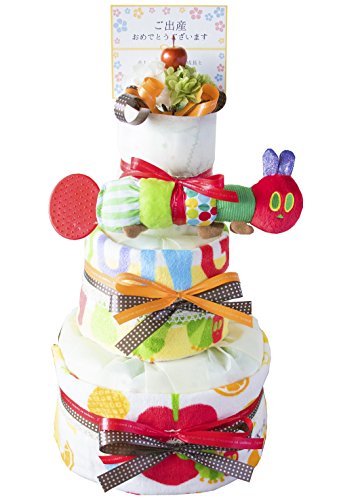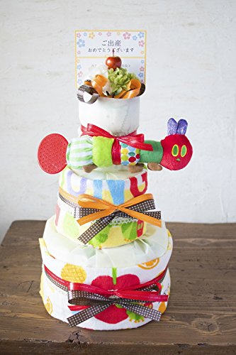 - 3段 はらぺこあおむしのタオル2枚W34cm×H35cm・オモチャ1つ おむつケーキ全体のサイズW22cm×H45cm