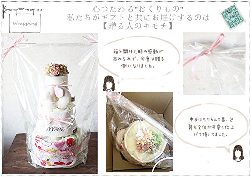 - おむつ:パンパーステープM 27枚 オーガニックスタイ1枚、りすさん木のおもちゃ日本製 今治タオルオーガニック1枚 全体のサイズ:w30cm×H43cm 花材:カーネーション あじさい ボタンフラワー2種 ライスフラワー(プリザーブドフラワー) その他:チスパ