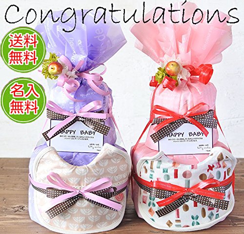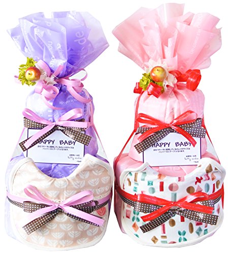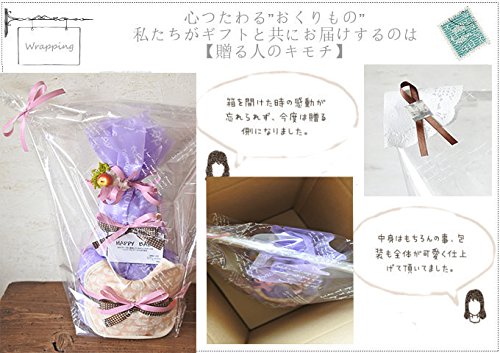 - ●おむつ:パンパース18枚 スタイ1枚:オーガニックGOTS認証 おむつケーキ 全体のサイズ:w20cm×H30cm 花材:あじさい(プリザーブドフラワー) その他:リンゴ