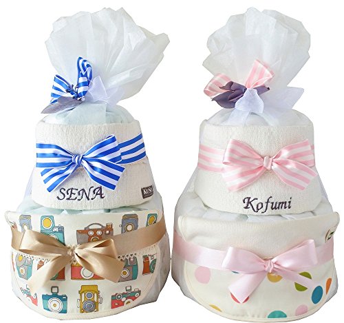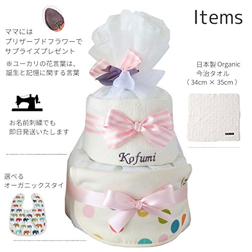 出産祝い おむつケーキ 北欧 GOTS認証 オーガニック 今治 タオル 名入れ おしゃれ (M, ドット柄 スタイ)