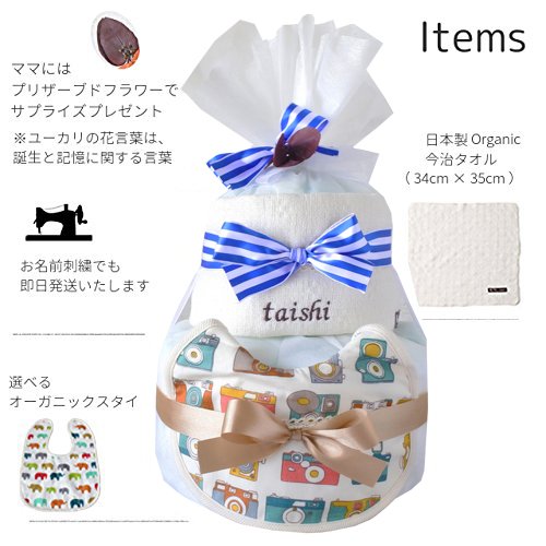 出産祝い おむつケーキ GOTS認証 北欧 ビブ オーガニック 今治 タオル 名入れ おしゃれ (S,カメラ)