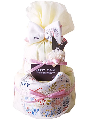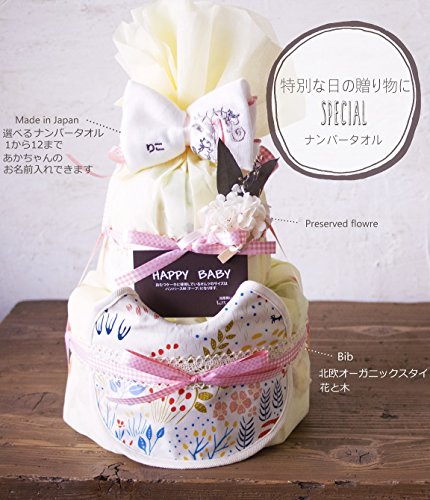 ママも大好き リボンが可愛い おむつケーキ 2段 日本製ナンバータオル 名入れ オーガニックスタイ 出産祝い 男の子 女の子 ギフト (S. 花と木)
