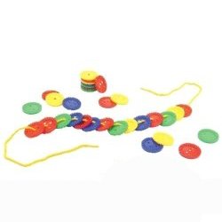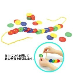 • カラフルなチップをひもに通していくおもちゃです。紐を通すだけでなく積み上げたりもできます。