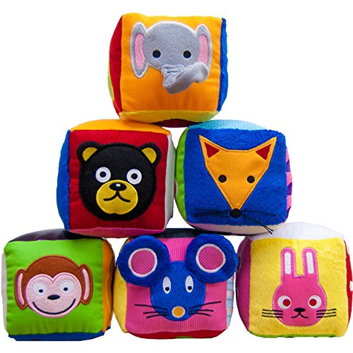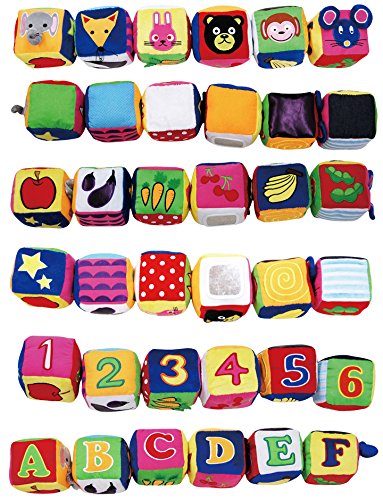 - 発達心理学に基づいた図柄・音・手触りで、五感を刺激する布製のソフトブロック。