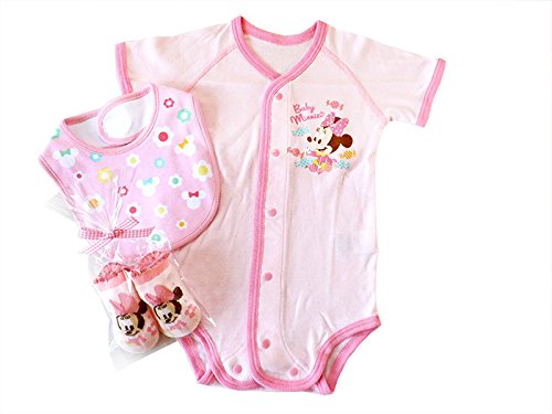 - ミニーマウスのベビーソックス、スタイ、半袖ボディスーツつき